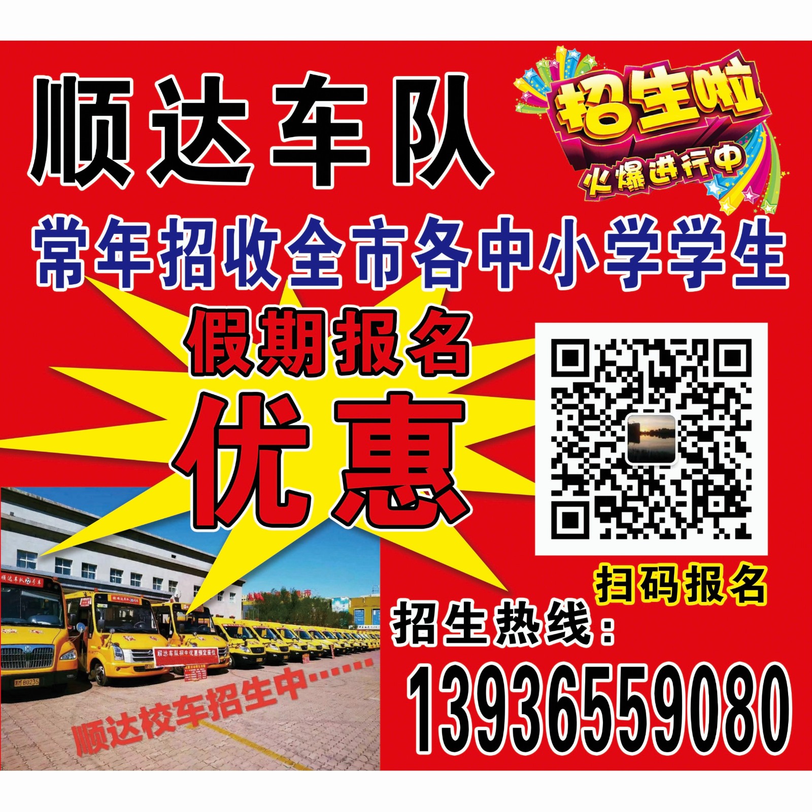 ☀️保障學(xué)生安全,尊重家長(zhǎng)意見;肩負(fù)社會(huì)責(zé)任,守護(hù)祖國(guó)未來。 順達(dá)校車車隊(duì)暑期優(yōu)惠招生活動(dòng)開始了!招生范圍包括市內(nèi)各個(gè)中小學(xué)校。報(bào)名電話:13936559080