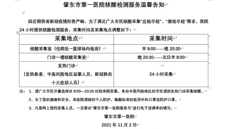 因近期我省新冠疫情形勢嚴峻,為了滿足廣大市民核酸采集“應(yīng)檢盡檢”、“愿檢盡檢”需求,我院24小時提供核酸檢測服務(wù)。采集時間及采集地點調(diào)整如下: