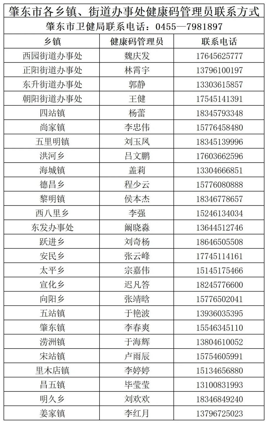 后附:肇東市各鄉(xiāng)鎮(zhèn)、街道辦事處健康碼管理員聯(lián)系方式
