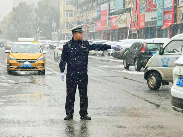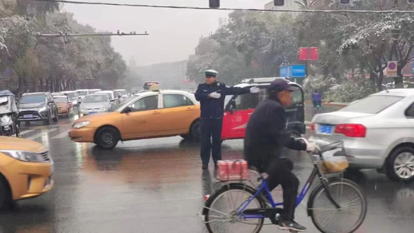 正值上學(xué)上班早高峰時段,雪勢愈發(fā)急切。路上的車流量正逐漸增大,一排排車輛披著白皚皚的雪花,司機們開啟行車燈,打開雨刮,小心翼翼地駕駛著車輛。此時,從主干道到居民區(qū)的街巷,身著制服的交警身影早已鋪開,在風(fēng)雪中織就了一張守護(hù)之網(wǎng)。在城區(qū)主要交通樞紐、小區(qū)門口、學(xué)校周邊,忙碌的交警隨處可見。雪花落在帽檐上化成水珠,順著臉頰往下淌,他們卻無暇顧及擦拭。他們的指揮手勢始終沉穩(wěn)而有力,每一次抬臂、轉(zhuǎn)向,都仿佛在風(fēng)雪中劃出了安全的坐標(biāo),給過往司機“吃下安全的定心丸”。