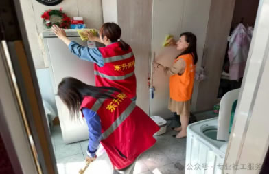 活動中,社工站的同志和社區(qū)干部、網(wǎng)格員,明確分工、大家手持抹布、拖把等工具,來到張大娘的家中,對老人房間內(nèi)的雜物進(jìn)行分類整理,重點擦拭玻璃、清潔地面、整理物品,確保不留衛(wèi)生死角。經(jīng)過數(shù)小時的辛勤勞動,張大娘家中環(huán)境煥然一新,為老人們創(chuàng)造了更加舒適、整潔的居住環(huán)境。