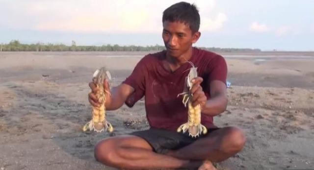 他小伙也不甘落后,紛紛跟著來(lái)捉蝦,圖中是一個(gè)小伙的成果! 瀨尿蝦也叫螳螂蝦。沒(méi)想到這種蝦不是和其他蝦一樣生活在海底,而是生活在海灘的泥洞里,他們常在淺海沙底或泥沙底掘穴,穴多為「U」字形。