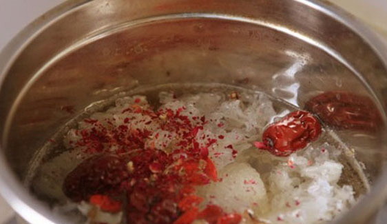 銀耳最好先在水中泡15分鐘,選材不要超級白的銀耳,銀耳不是約白越好,把所有的輔料都丟進(jìn)鍋里就好了。